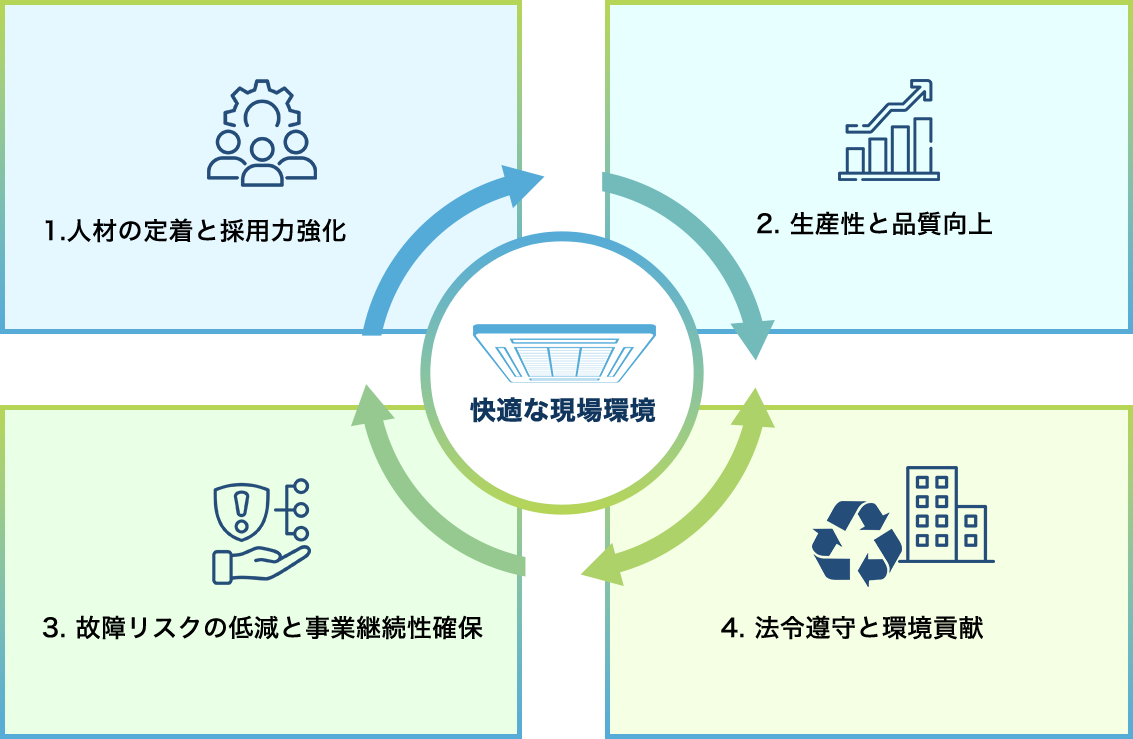 私たちが提案する業務用空調設備の更新は、単なる設備投資ではありません。従業員一人ひとりが「働きやすい」と実感できる職場環境を創り出し、人材の定着と採用競争力の向上を実現する、極めて重要な「人的資本経営」の一環です。